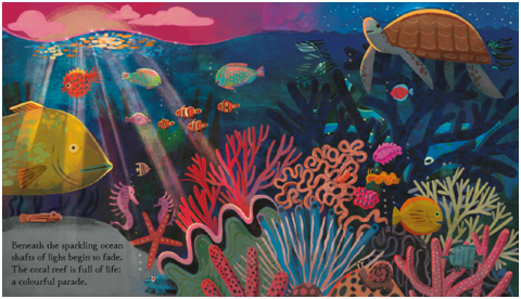 月光透進海裡,水母依偎著珊瑚礁,散發柔和光芒。
