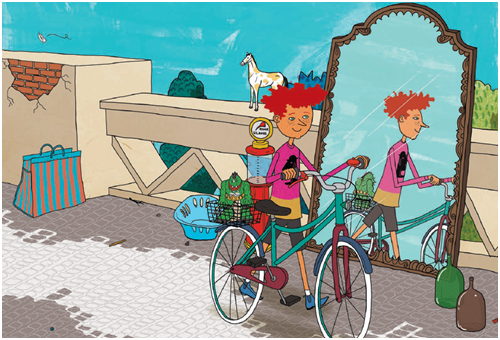 面對鏡子,你知道小男孩在腳踏車左邊還是右邊嗎?