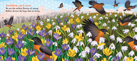 春天來臨,雪蓮花和番紅花搶先登場。 它們引來的蟲子,成了知更鳥的糧食。
