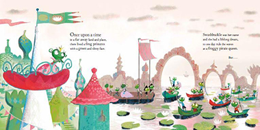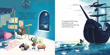 某個夜黑風高的晚上,青蛙公主下定決心追逐自己的夢想,她換上一身帥氣的服裝,划著荷葉登上了一艘海盜船…